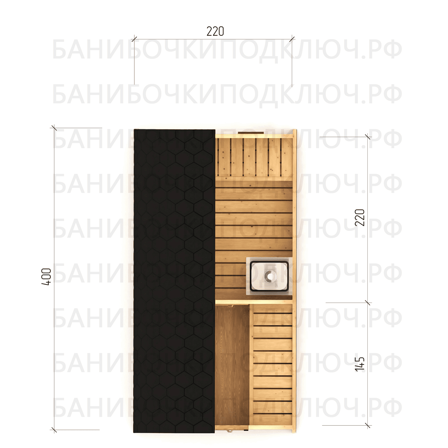 комната отдыха – 200х400, парная 250х220, мойка 150х220